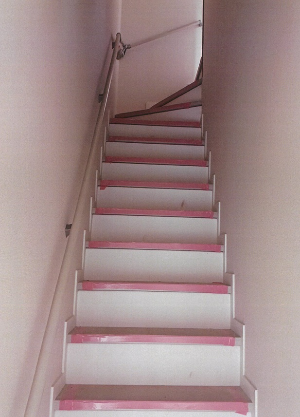 鉄骨階段後、建築にて踏板(集成材)と壁付手摺りをご対応頂きました。