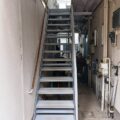 踏板・床板は縞鋼板を使用し、鉄骨の表面処理は溶融亜鉛メッキを施してあり、縞鋼板+溶融亜鉛メッキ、アルミ製縦格子手摺りで防錆性・メンテナンス性に優れた仕様です。